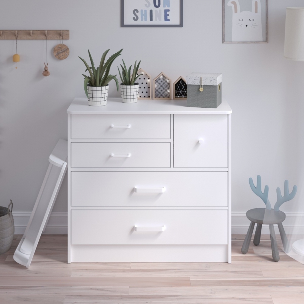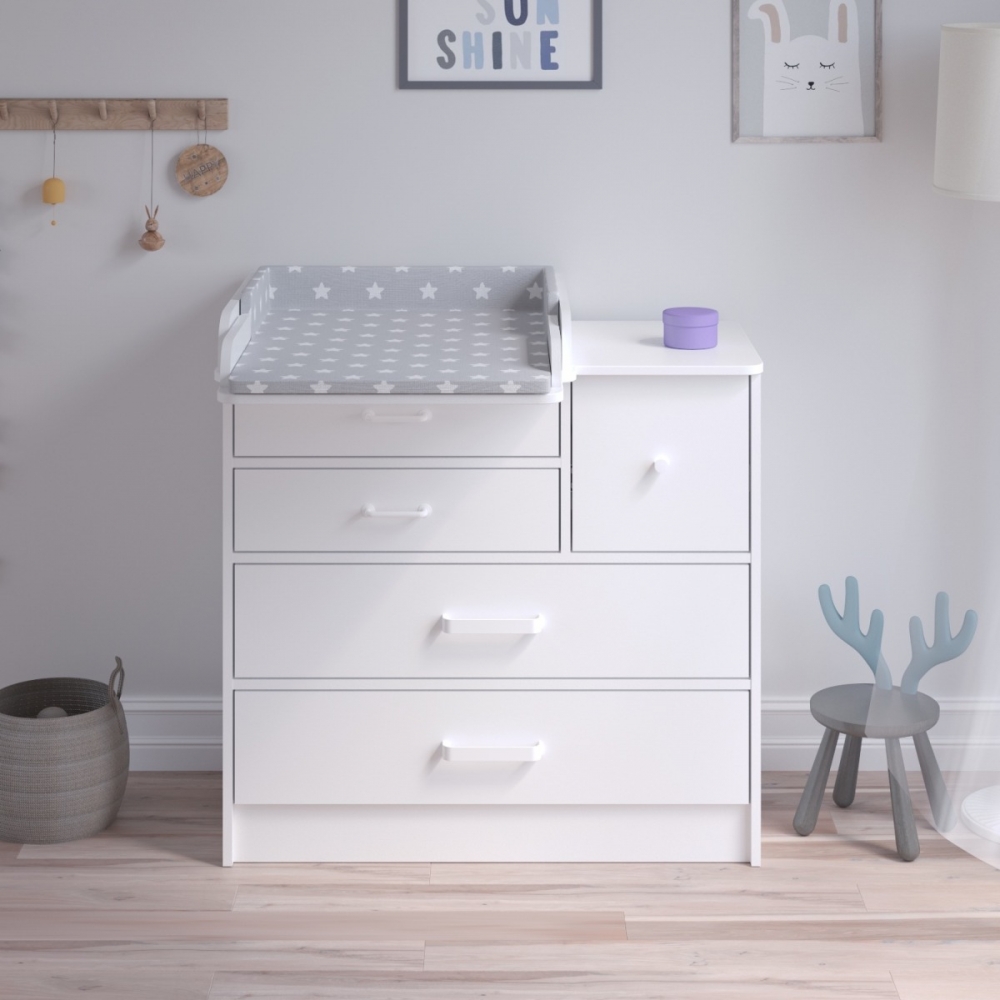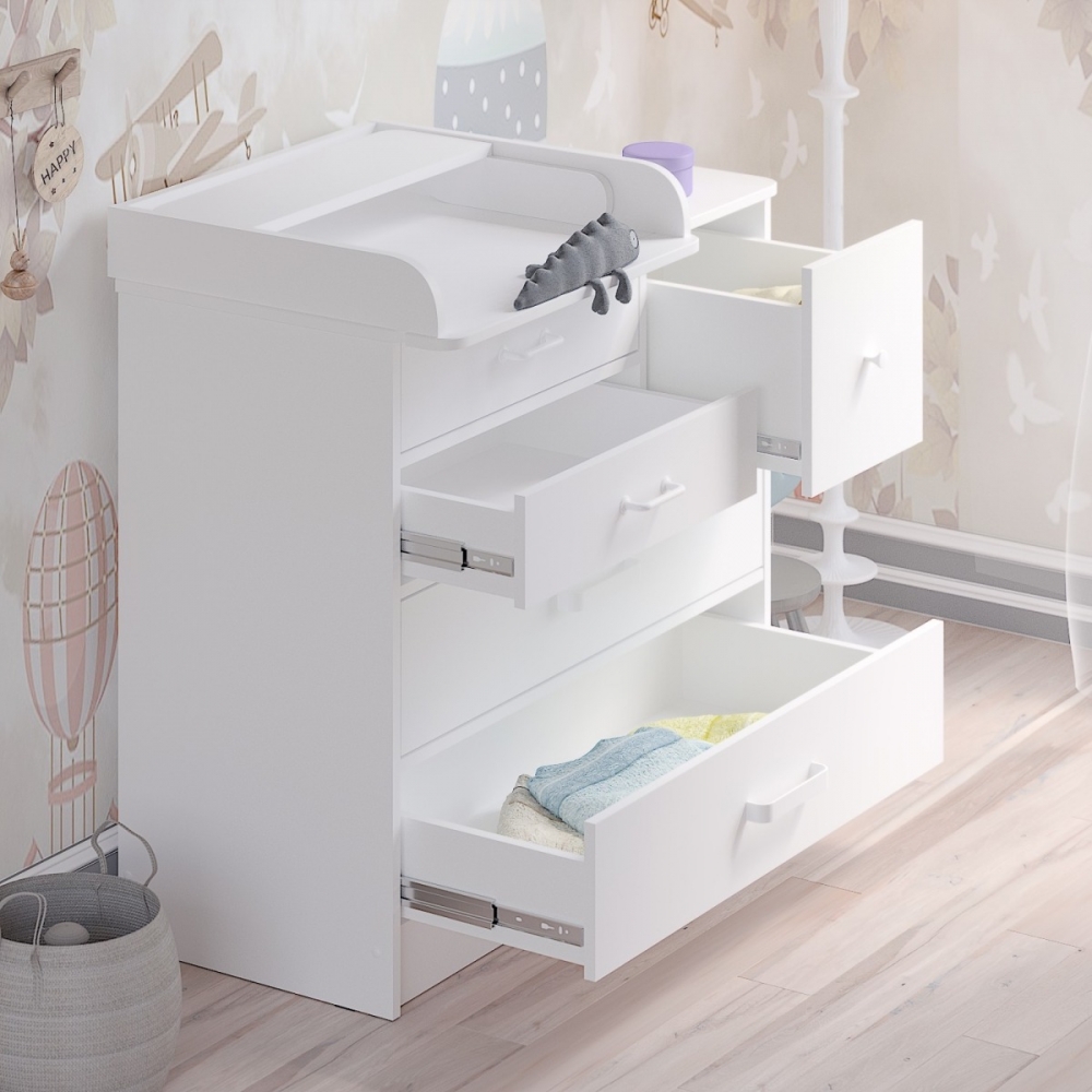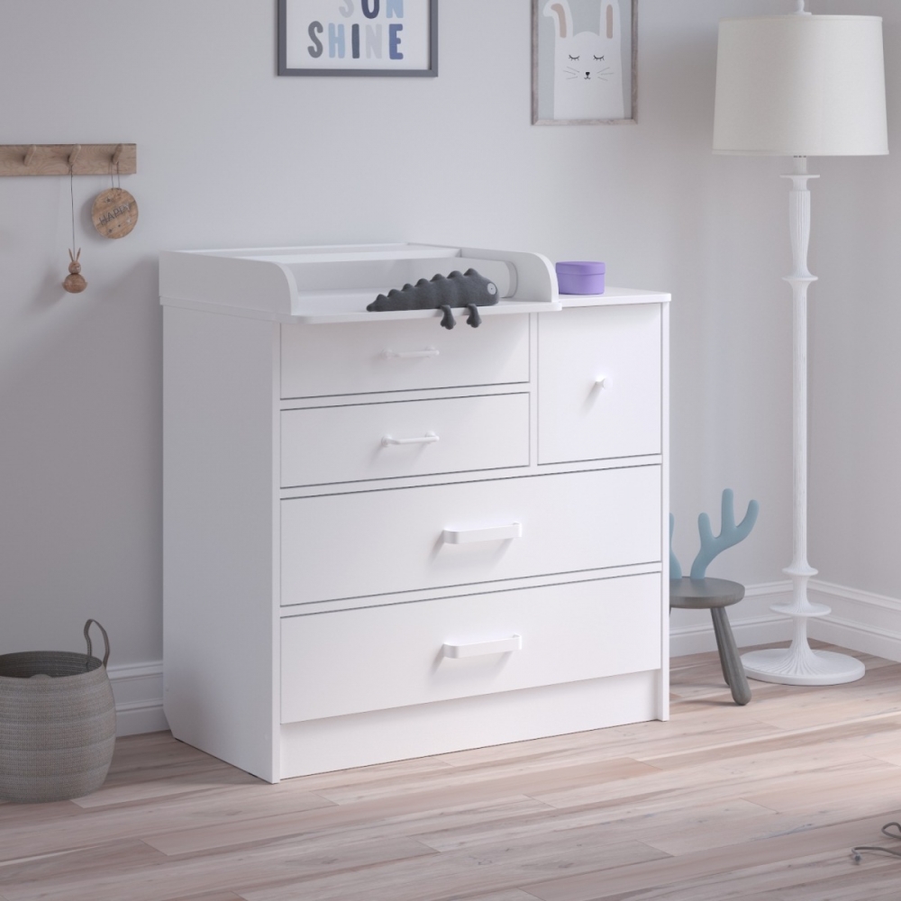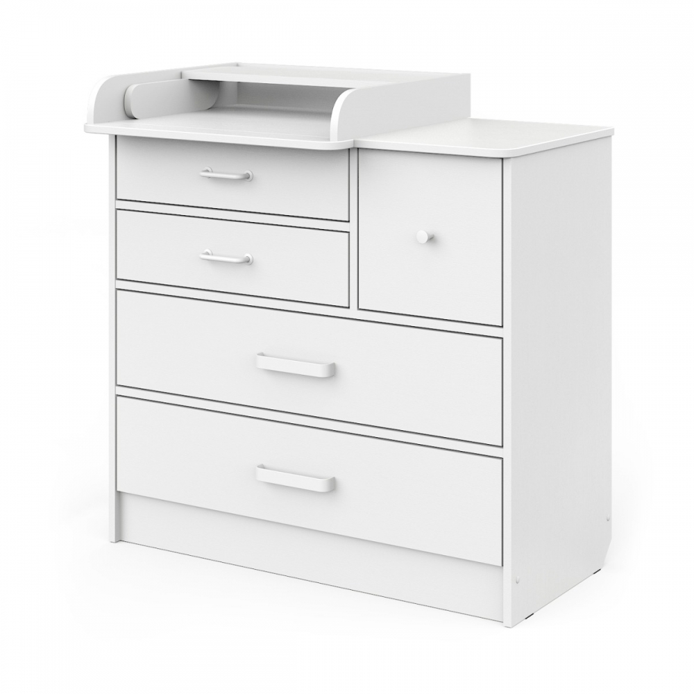 Удобный ящик, расположенный справа от пеленального столика, позволяет держать под рукой еще больше вещей, необходимых при занятиях с новорожденным малышом. Дизайнерские ручки на изделии выгодно подчёркивают внешний вид комода.