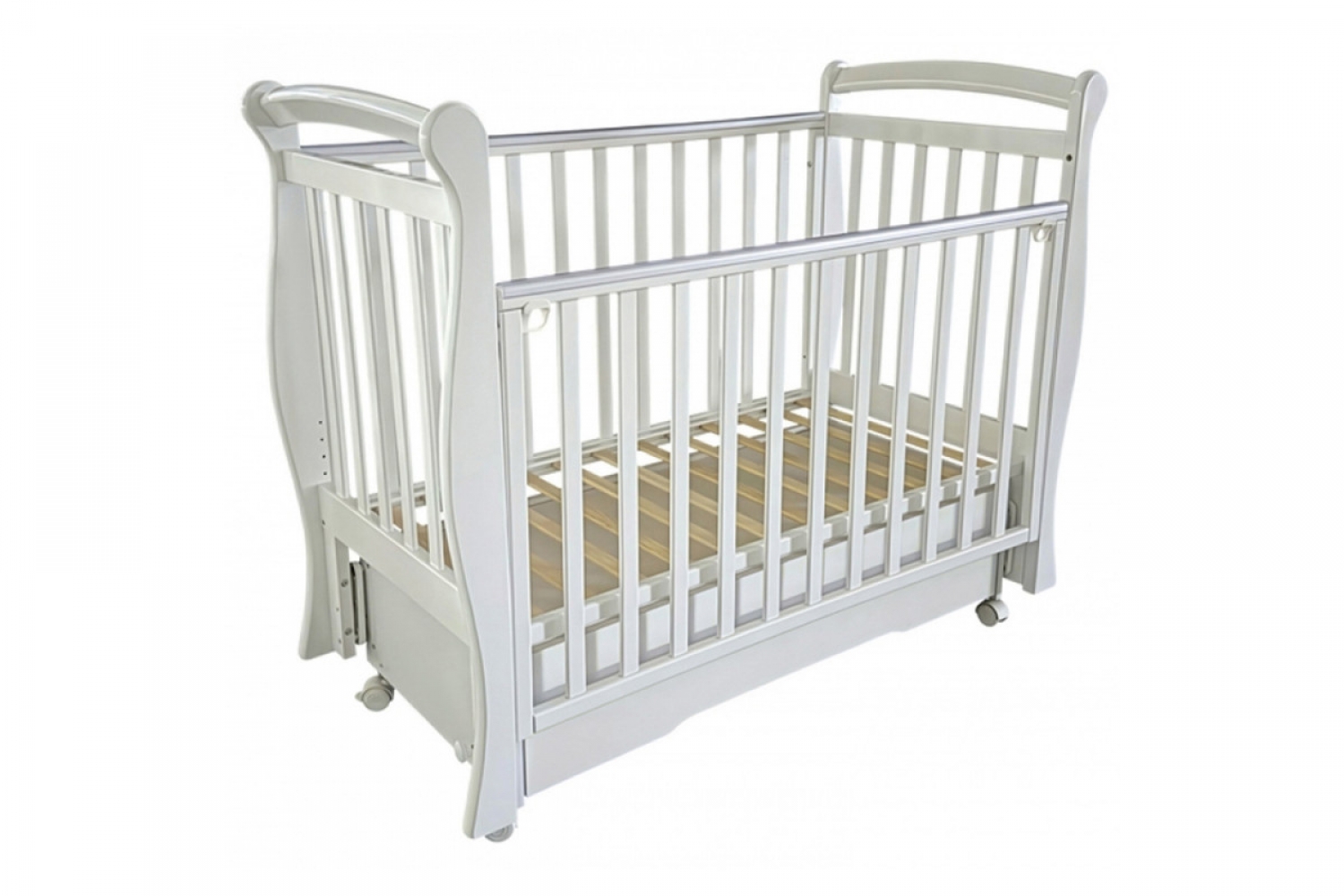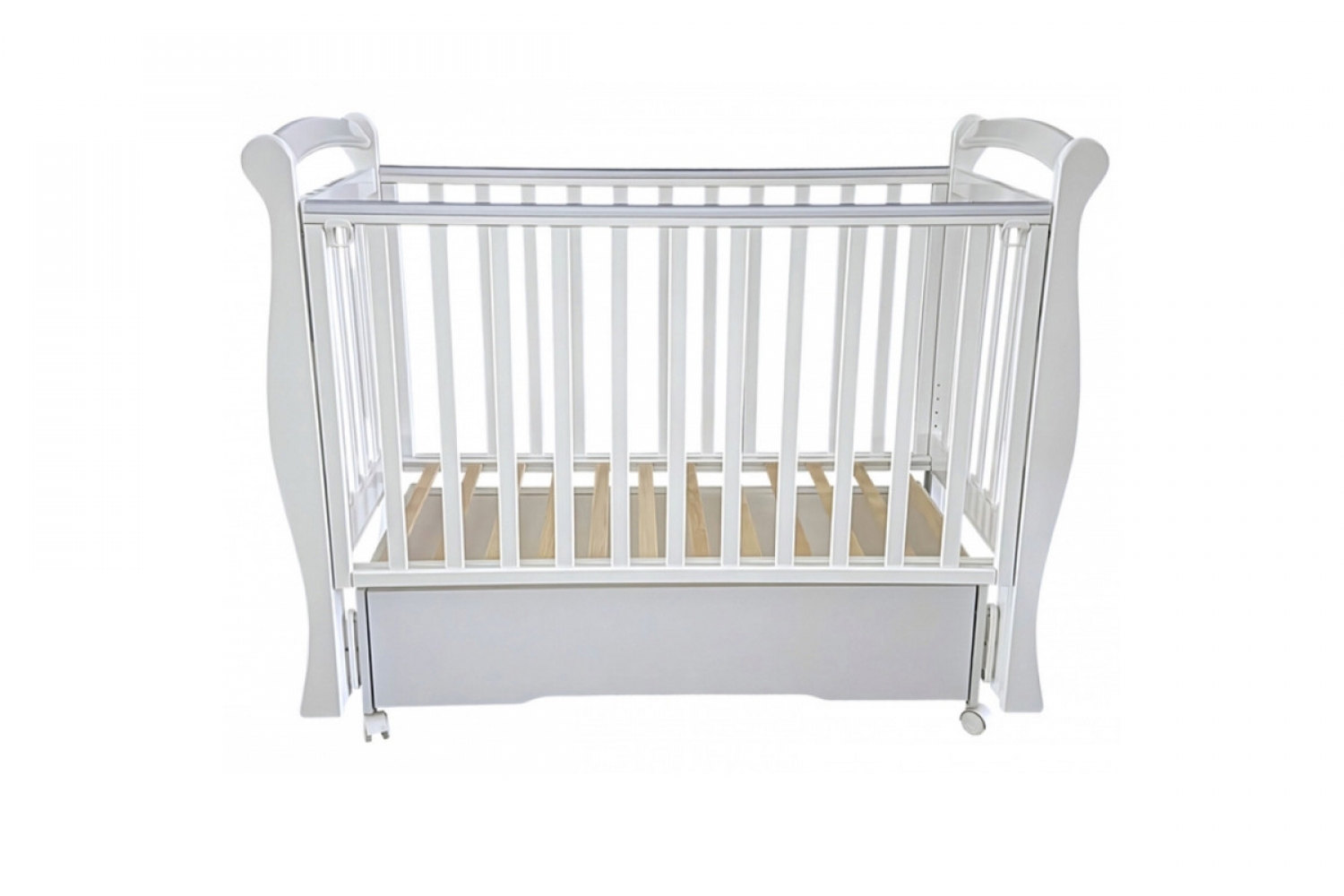 Кроватка оснащена универсальным маятниковым механизмом с возможностью продольного и поперечного качания, а также колесами для удобного перемещения. Передняя стенка съемная, с механизмом автоматического опускания, что облегчает доступ к ребенку. Реечное ортопедическое ложе регулируется по высоте в трех положениях. В основании предусмотрен закрытый ящик для хранения детских принадлежностей.
