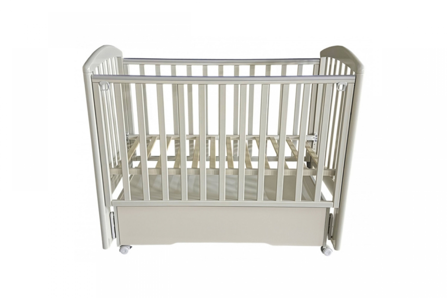 Кроватка оснащена универсальным маятниковым механизмом с продольным и поперечным качанием, а также колесами для удобного перемещения. Съемная передняя стенка с механизмом “автостенка” облегчает доступ к ребенку. Реечное ортопедическое ложе регулируется по высоте в трех положениях, что позволяет использовать кроватку на протяжении взросления малыша.