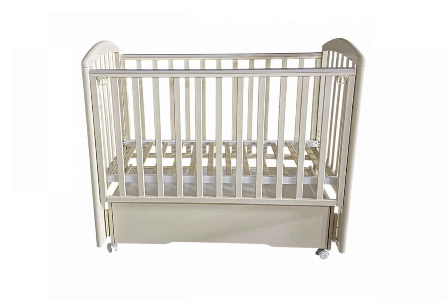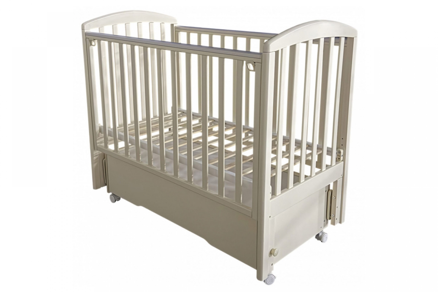 Кроватка оснащена универсальным маятниковым механизмом с продольным и поперечным качанием, а также колесами для удобного перемещения. Съемная передняя стенка с механизмом “автостенка” облегчает доступ к ребенку. Реечное ортопедическое ложе регулируется по высоте в трех положениях, что позволяет использовать кроватку на протяжении взросления малыша.