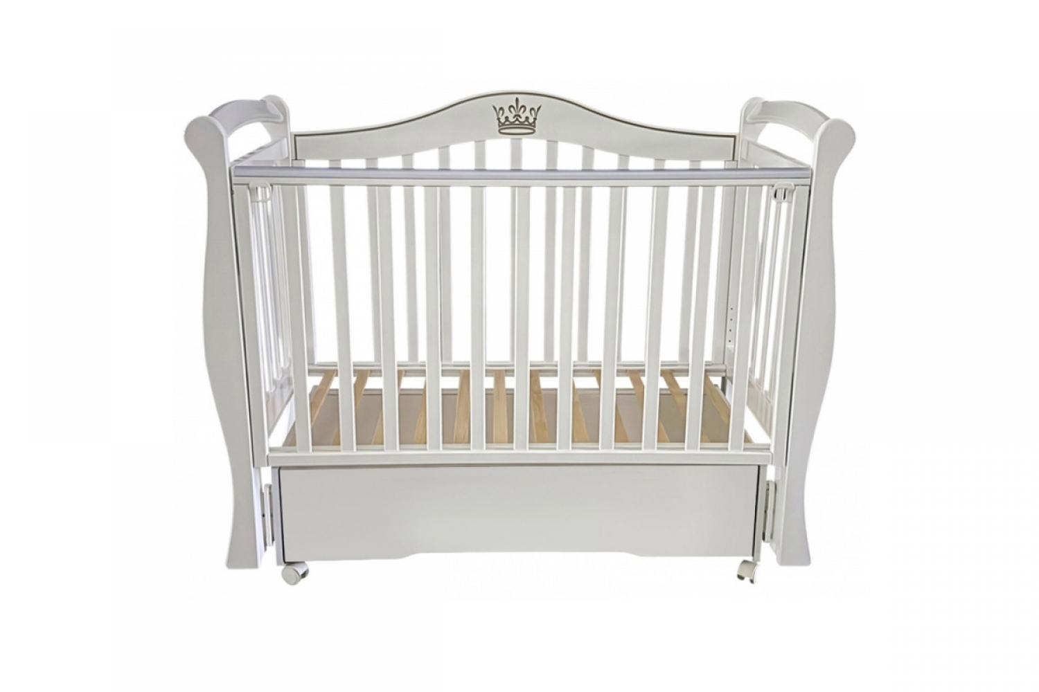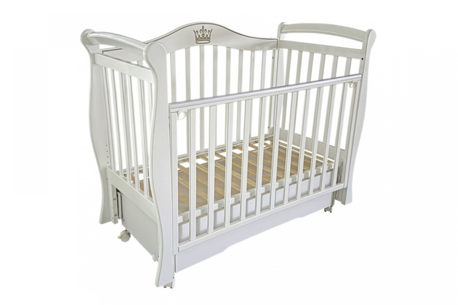 Кроватка оснащена универсальным маятником с продольным и поперечным качанием, колесами для перемещения и съемной передней стенкой с механизмом автоматического опускания. Реечное ортопедическое ложе регулируется по высоте. В основании расположен закрытый ящик для хранения вещей.