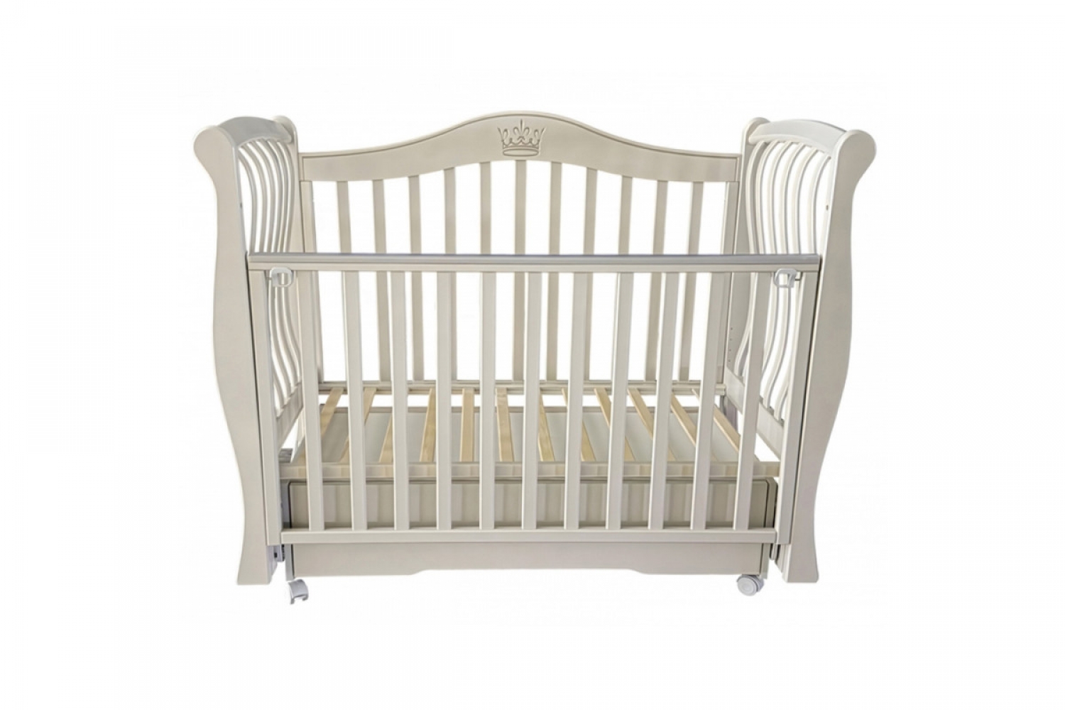 Модель имеет съемную переднюю стенку с механизмом автостенки, что упрощает доступ к ребенку. Реечное ложе регулируется по высоте, позволяя адаптировать кроватку под растущего ребенка. Вместительный закрытый ящик обеспечивает дополнительное место для хранения постельных принадлежностей и детских аксессуаров.