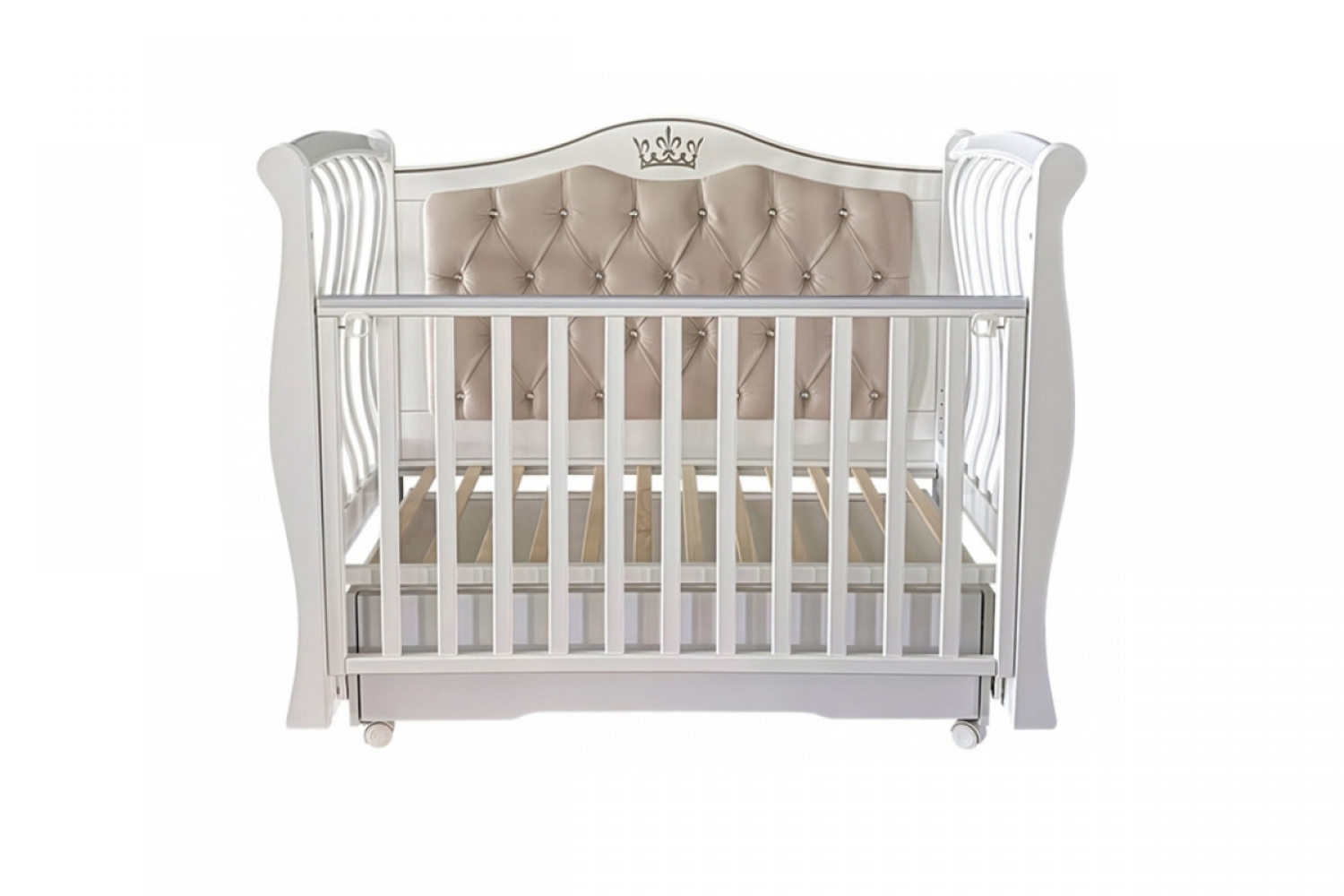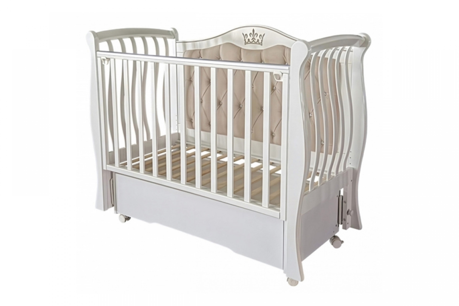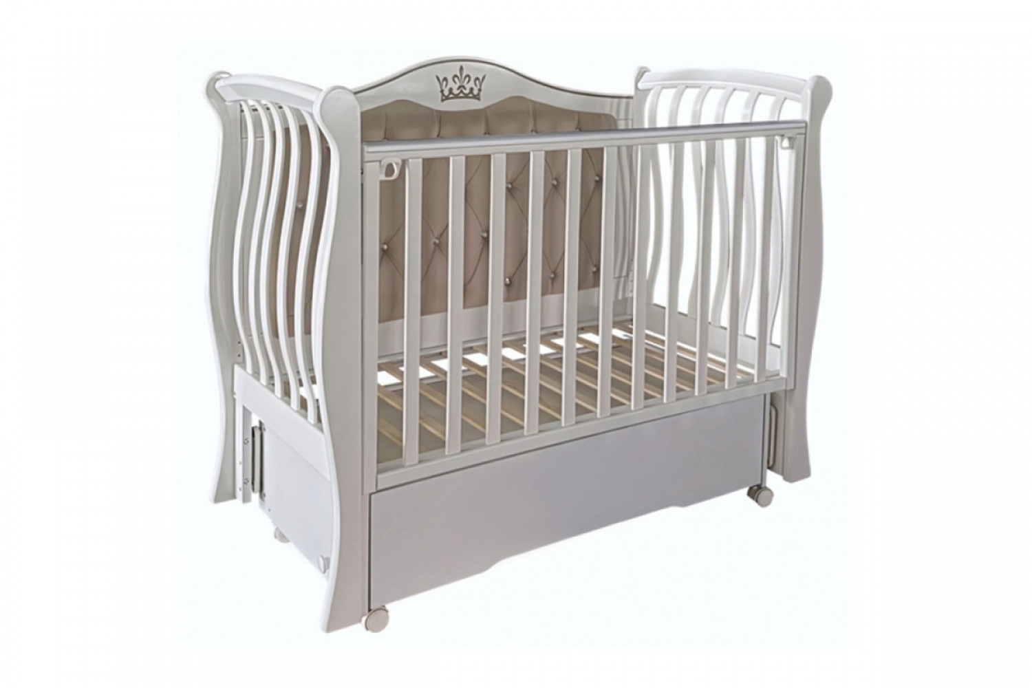 Кроватка оснащена универсальным маятниковым механизмом с возможностью продольного и поперечного качания, а также колесами для удобного перемещения. Съемная передняя стенка с механизмом автостенки облегчает ежедневный уход за малышом. Реечное ложе регулируется по высоте в двух положениях и подходит для использования на разных этапах роста ребенка.