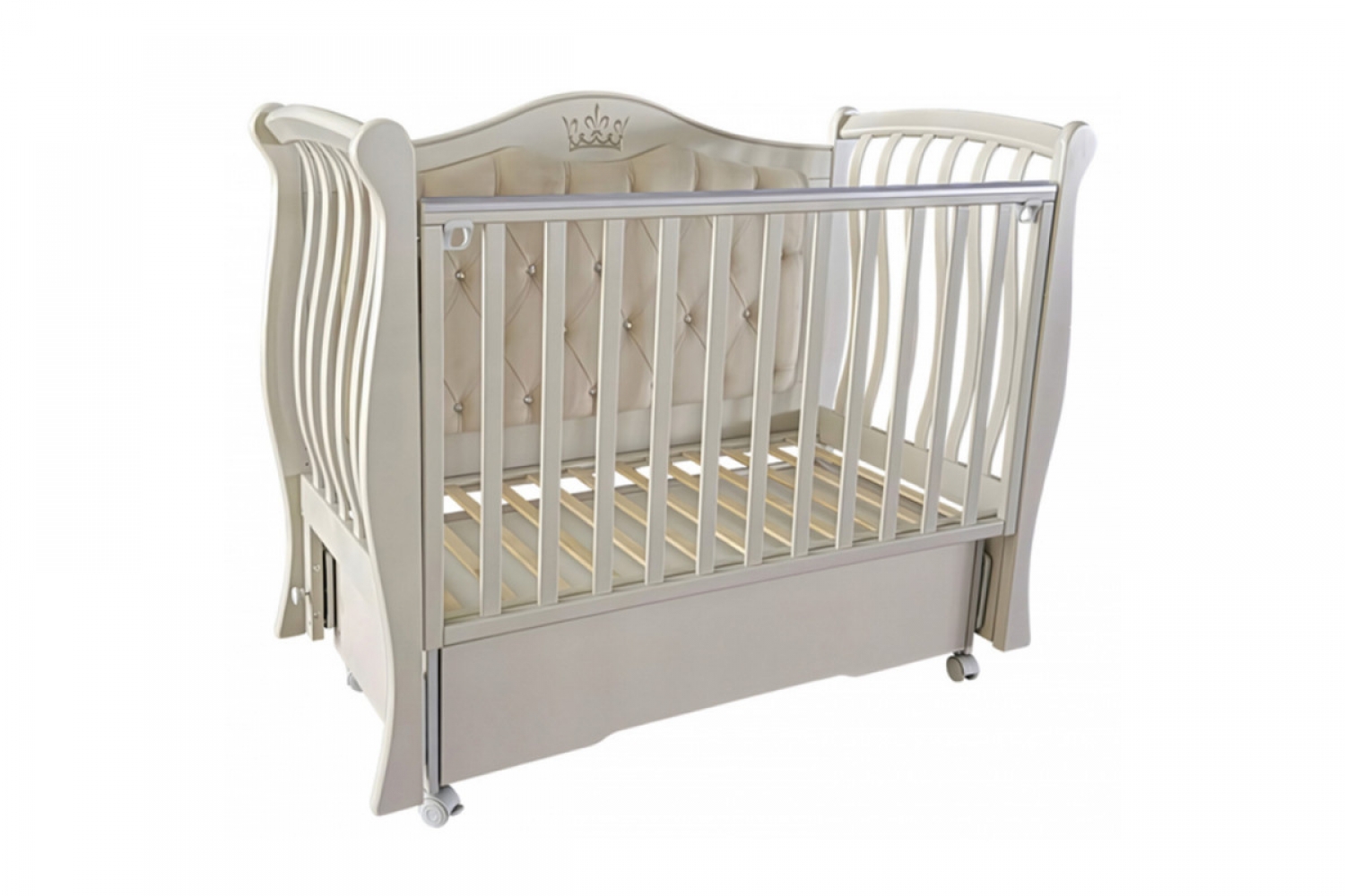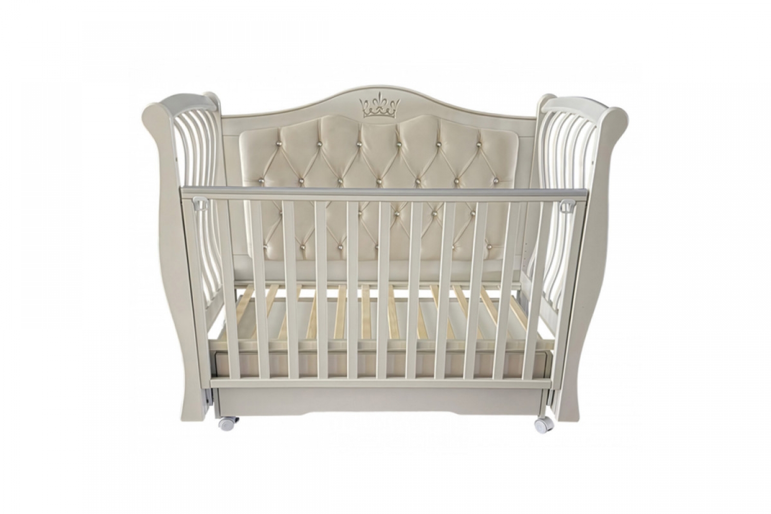 Кроватка детская LUIZA-333 с мягкой спинкой (универсальный маятник, колеса, ящик, автостенка)