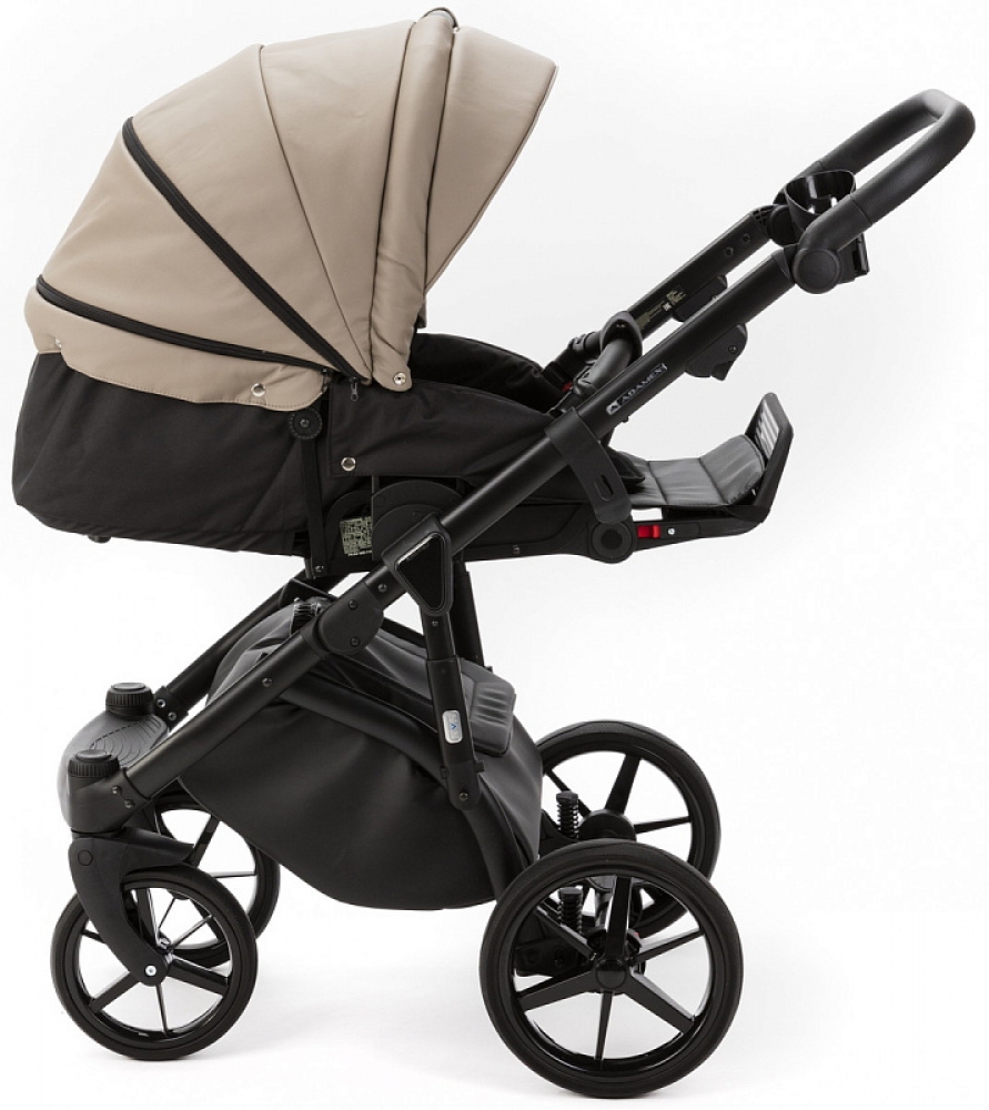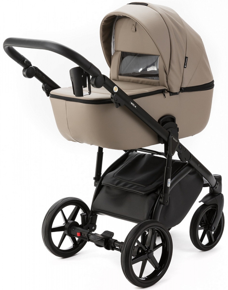 Корпус люльки пластиковый, обтянут эко-кожей. В донышко люльки встроено регулируемое вентиляционное окно. Люлька оборудована регулируемым по высоте подголовником, регуляция расположена с внешней стороны.Внутренняя обивка выполнена из хлопковой ткани.Люлька реверсивная, ее можно установить в положение «ребенок лицом к родителю», «ребенок лицом к направлению движения».Капюшон люльки 3-х сегментный капюшон с козырьком от солнца и дополнительным 4-м сегментом на молнии, под которым расположена анти-москитная сетка для проветривания. В капюшон встроена ручка для переноски люльки, ручка расположена под молнией.Накидка крепится к люльке с помощью молнии. Накидка оснащена откидным клапаном под клапаном расположено смотровое окно.