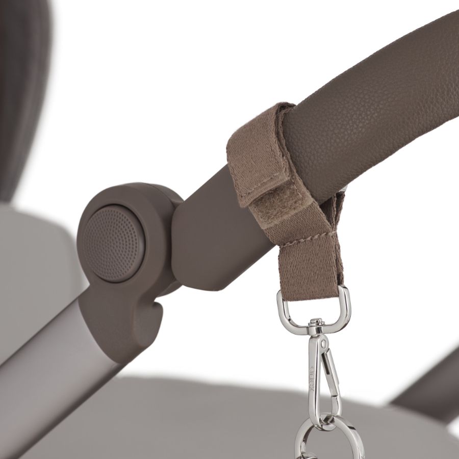 Универсальные ремни позволяют легко прикрепить сумку к любой коляске. Полукольцо с логотипом служит для крепления плечевого ремня или универсального крепления к раме коляски.