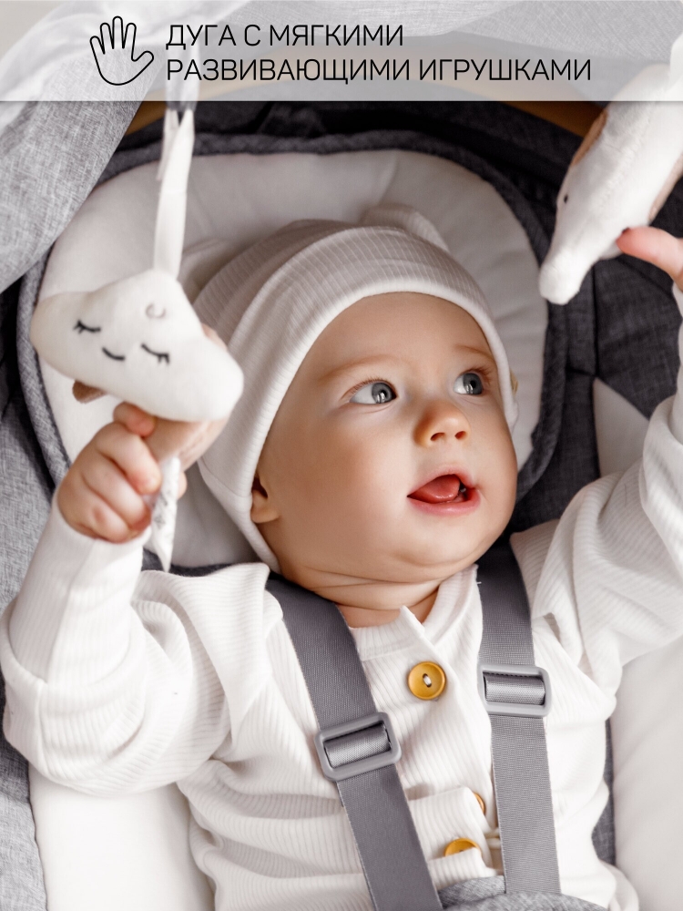 Ну а пока малыш не заснул, он может поиграть с очаровательными мягкими игрушкам, которые закреплены в непосредственной близости от ребенка. Такая игра хорошо развивает мелкую моторику рук и способствует раннему развитию.