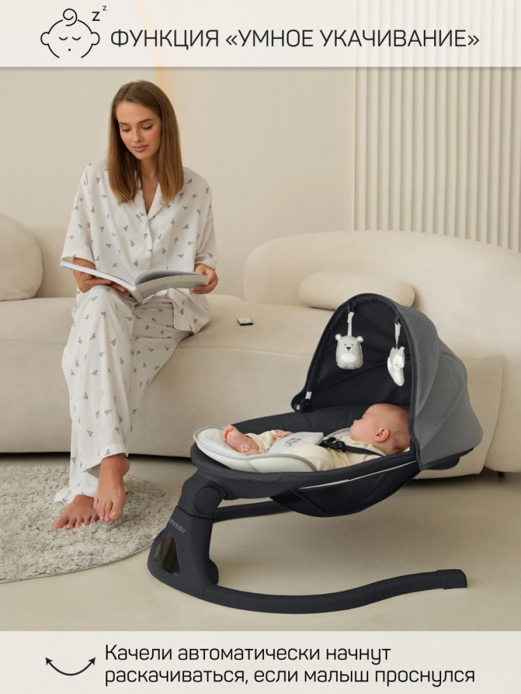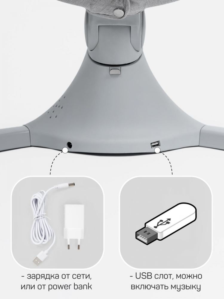 Электрокачели для новорожденных оснащены очаровательными мягкими игрушками с погремушками, это стимулирует развитие мелкой моторики рук и обеспечивает дополнительное развлечение для малыша. Так же, модель оснащена не только возможностью питания от сети при помощи встроенного кабеля, но и от элементов питания АА (батареек/аккумуляторов, в комплект не входят). Вы можете использовать ее не только дома, но и в поездках или на даче.