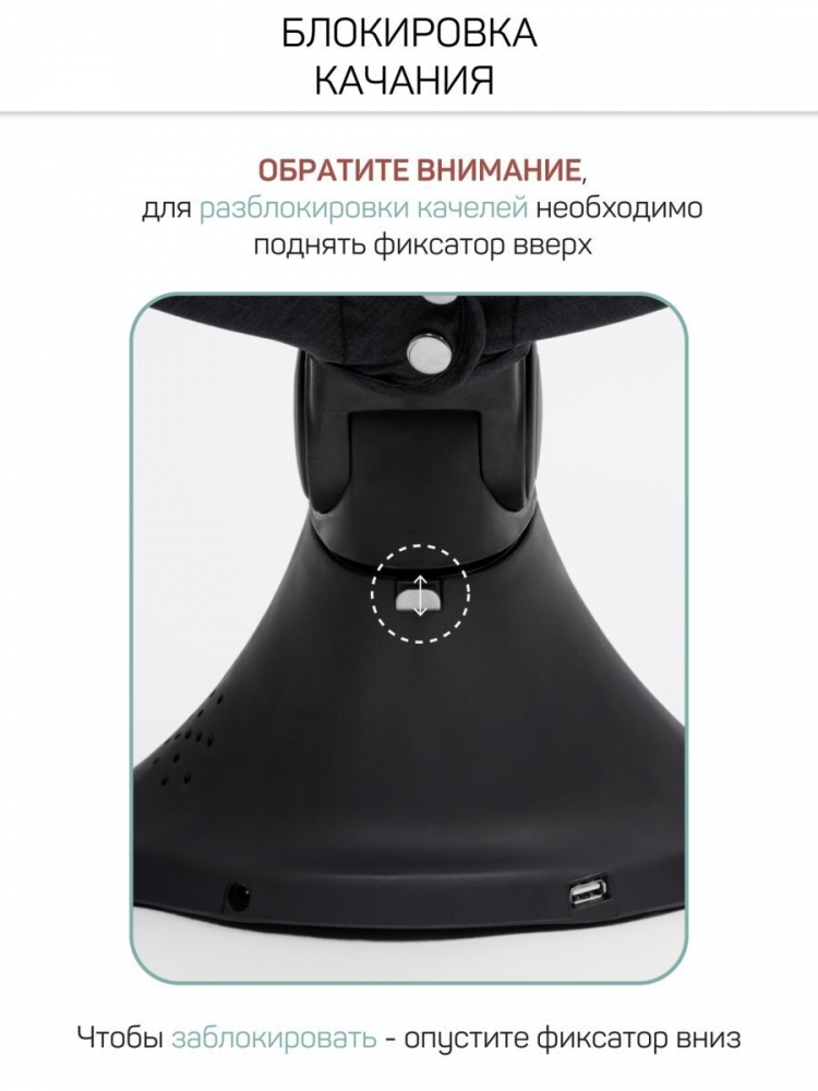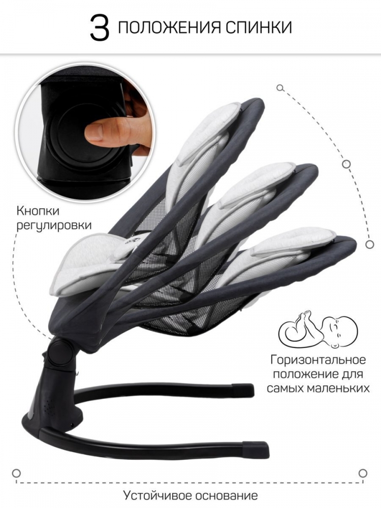 Комфортные ремни безопасности с гибкой регулировкой, надежно удерживают ребенка в качелях, обеспечивая ему повышенную безопасность. С помощью пульта ДУ, который идет в комплекте, вы легко сможете управлять функциями электрокачели на расстоянии, продолжая заниматься домашними делами. 5 скоростей укачивания позволяет настроить интенсивность качания в соответствии с вашими предпочтениями.