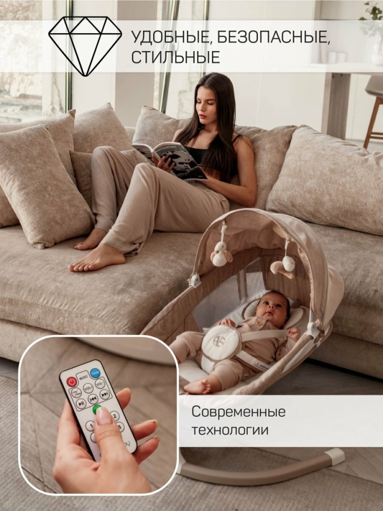 Приятные мелодии из 12 предложенных вариантов, создадут вашему малышу спокойную и уютную атмосферу. А с помощью функции Bluetooth вы сможете поставить любую детскую песенку, которая по душе вашему малышу. Ремни безопасности надежно удерживают ребенка в качелях, обеспечивая ему безопасность и комфорт. С помощью пульта, который идет в комплекте, вы легко и просто сможете управлять электрокачелями.