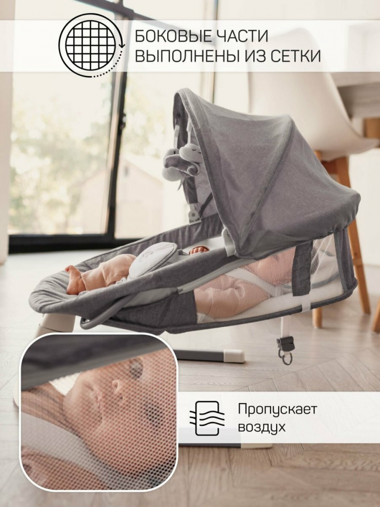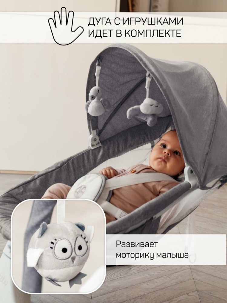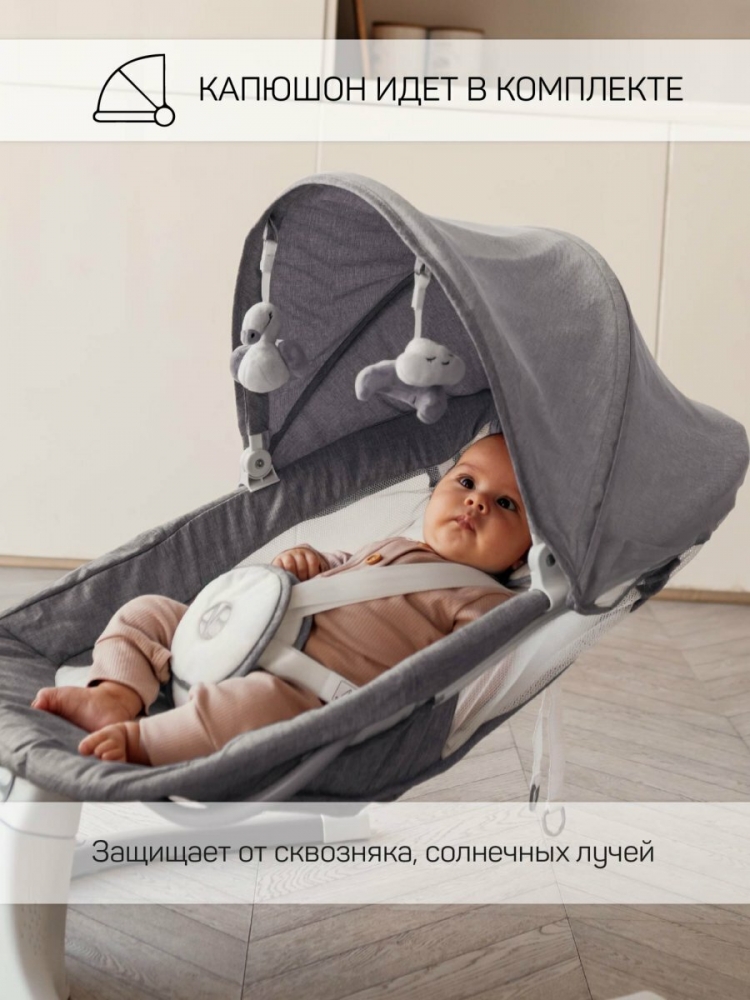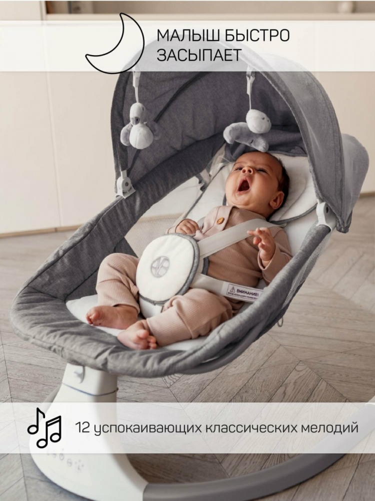 Пятискоростной режим укачивания позволяет настроить интенсивность качания в соответствии с предпочтениями вашего младенца. Чтобы обеспечить максимальный комфорт, электрокачели для новорожденных имеют регулируемый угол наклона сиденья. Это позволяет вашему малышу отдохнуть и расслабиться в положении, которое ему нравится. Электрокачели для новорожденных с пультом оснащены очаровательными мягкими игрушками, которые закреплены на капюшоне в непосредственной близости от ребенка. Это стимулирует развитие мелкой моторики рук и обеспечивает дополнительное развлечение для малыша.