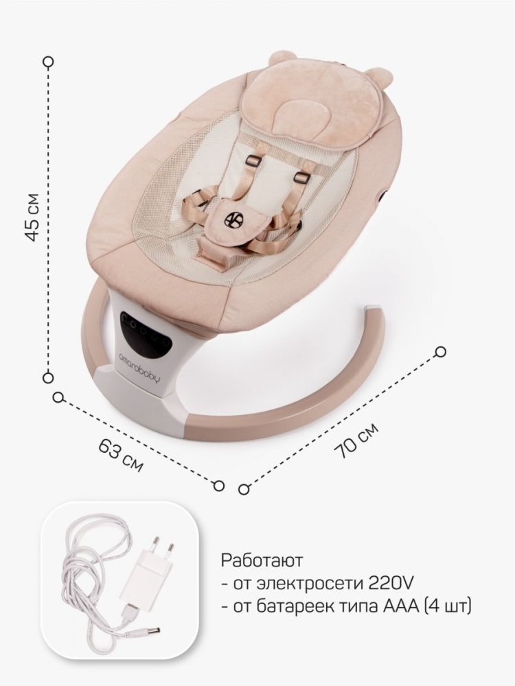 Электронные качели для малышей Amarobaby Teddy swing - это идеальное решение для заботливых мам. Они предлагают широкий спектр функций, чтобы обеспечить комфорт и развлечение для вашего малыша. Приятные мелодии из 12 предложенных вариантов, создадут вашему малышу спокойную и уютную атмосферу. А с помощью функции Bluetooth вы сможете поставить любую детскую песенку, которая по душе вашему малышу. Так же вы можете воспользоваться в usb носителем, заранее записав на него любимые сказки и мелодии в формате mp3. Ремни безопасности надежно удерживают ребенка в качелях, обеспечивая ему безопасность и комфорт. С помощью пульта ДУ, который идет в комплекте, вы легко сможете управлять функциями электрокачели. Пятискоростной режим укачивания позволяет настроить интенсивность качания в соответствии с предпочтениями вашего младенца. Электрокачели для новорожденных оснащены очаровательными мягкими игрушками, которые закреплены на капюшоне в непосредственной близости от ребенка. Это стимулирует развитие мелкой моторики рук и обеспечивает дополнительное развлечение для малыша. Чтобы обеспечить питание электрокачелей, вы можете использовать адаптер питания, который входит в комплект, или установить 4 батарейки типа ААА (в комплект не входят). Таким образом, вы можете использовать качели даже в отсутствие электричества или в поездках. Электрокачели Amarobaby имеют функцию автоматического отключения по таймеру через 8, 15 или 30 мин. Модель обладает необычным, стильным дизайном, который впишется в любой интерьер. Возможность использовать качели без матрасика в жаркую погоду позволит ребенку ощутить дополнительный комфорт во время сна, сетчатая спинка предотвратит перегревание. Так же матрасик оснащен двумя вариантами покрытия с разных сторон: лен и плюшевая ткань, чтобы сделать использование качели еще более комфортным для вас и вашего ребенка. Вы сможете менять ткань в зависимости от ваших предпочтений.