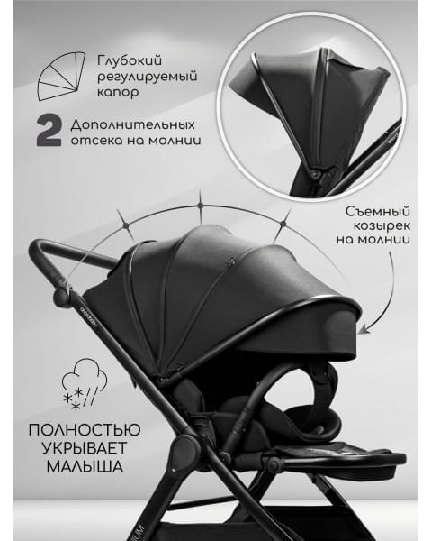 Для защиты от ветра и осадков предусмотрен глубокий капор (опускается до бампера), теплый чехол на ножки, дождевик и москитная сетка. Для макисмального комфорта ребенка предусмотрен мягкий съемный матрасик.