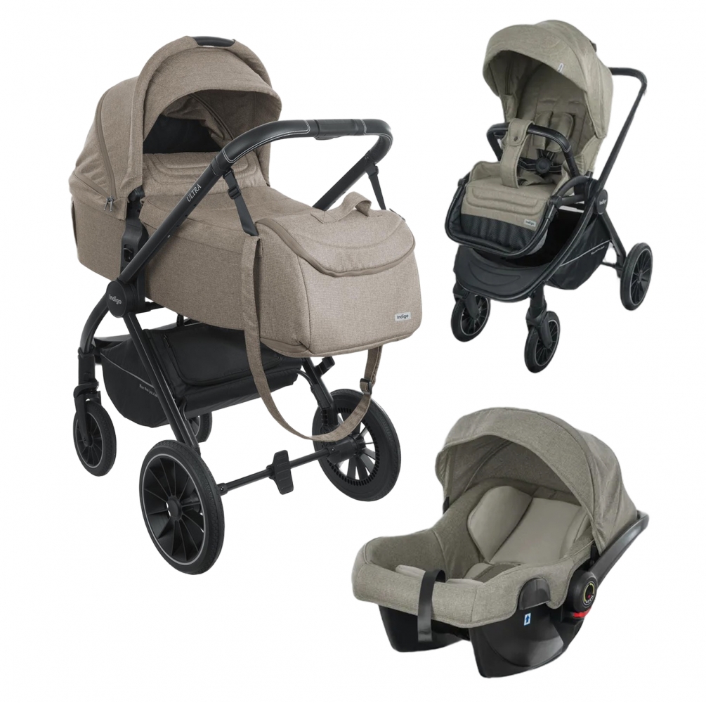 Детская коляска Indigo Ultra 3 в 1 – это универсальная и комфортная модель для малышей от рождения и до достижения веса в 15 кг. Она представляет собой модульную систему, которая включает в себя три основных блока: люльку, прогулочный блок и автокресло.