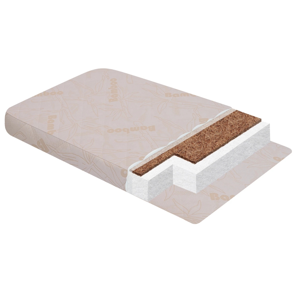 - Кокос 1 см: натуральный слой для равномерной жесткости и длительного использования, поддерживает позвоночник ребенка в правильном положении.