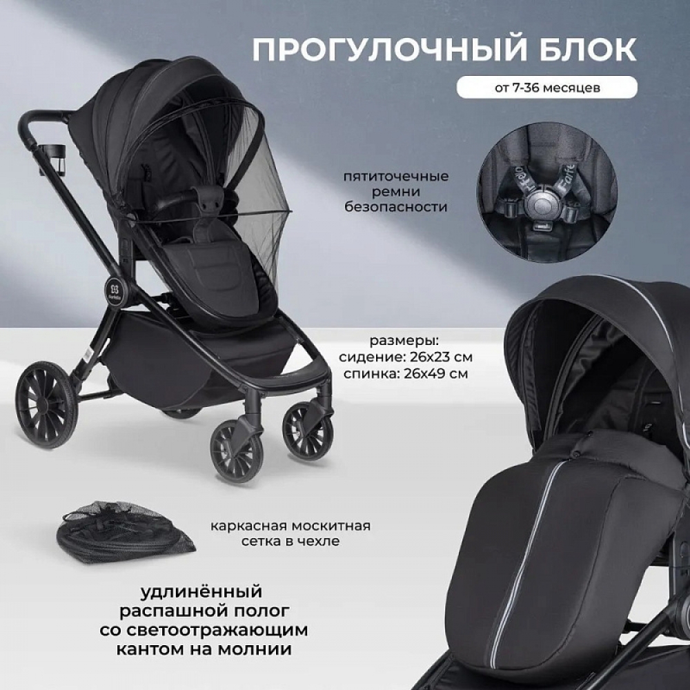 В комплекте: матрасик memory foam, сумка, каркасная москитная сетка в чехле, подстаканник, накидка на ножки в прогулочном блоке и в автолюльке.