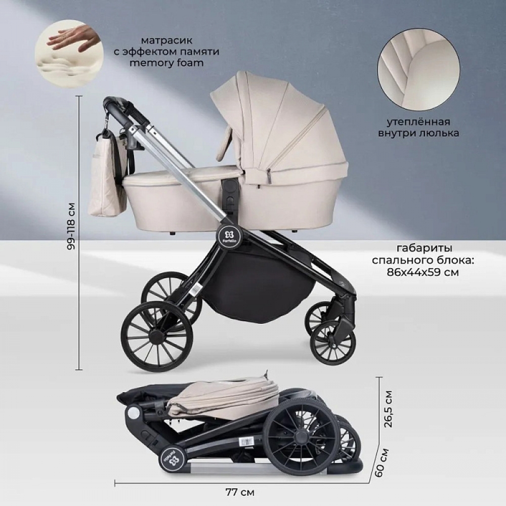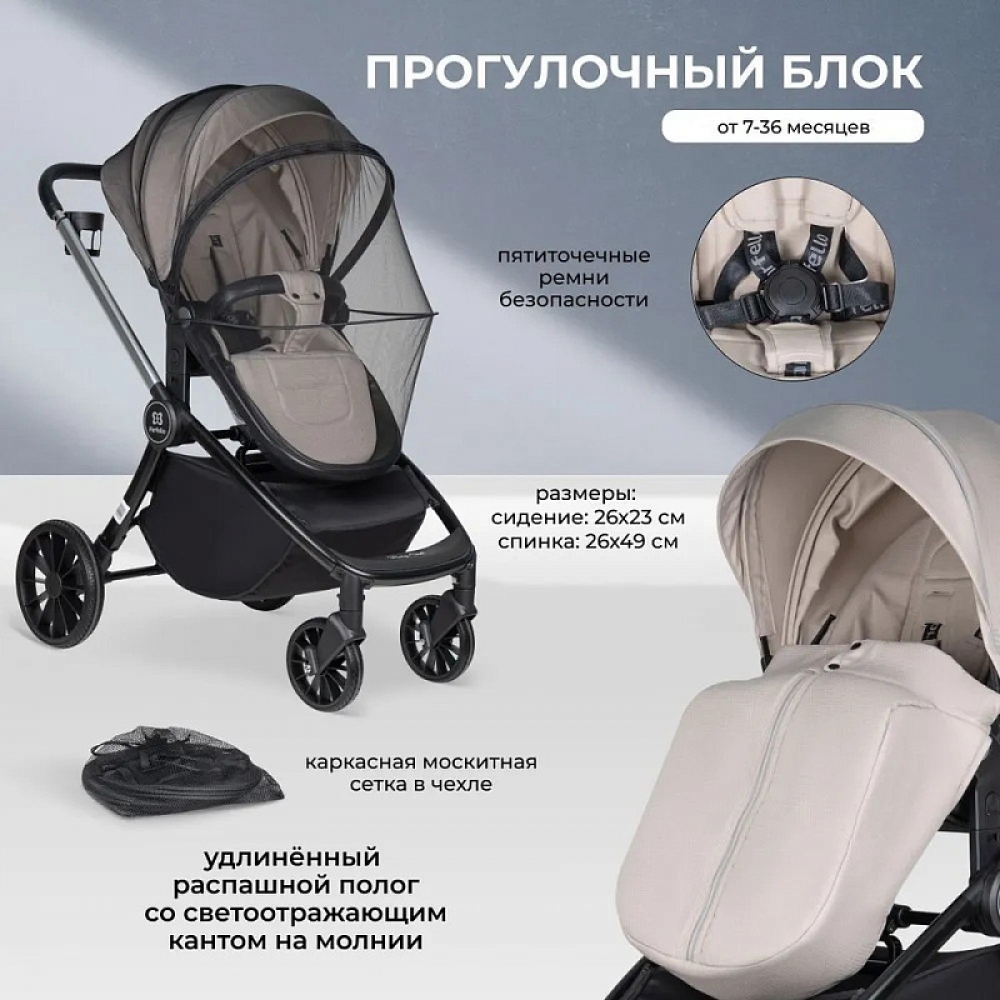 В комплекте: матрасик memory foam, сумка, каркасная москитная сетка в чехле, подстаканник, накидка на ножки в прогулочном блоке и в автолюльке.