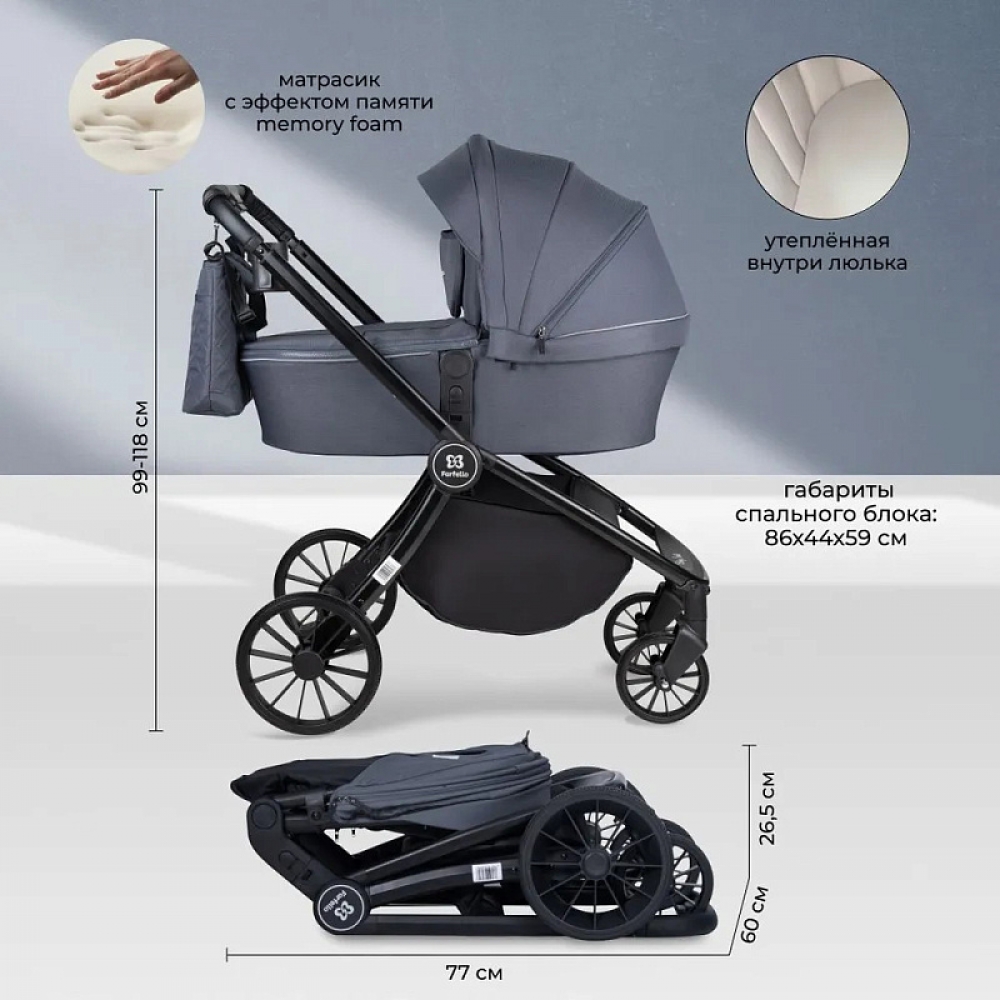 В комплекте: матрасик memory foam, сумка, каркасная москитная сетка в чехле, подстаканник, накидка на ножки в прогулочном блоке и в автолюльке.