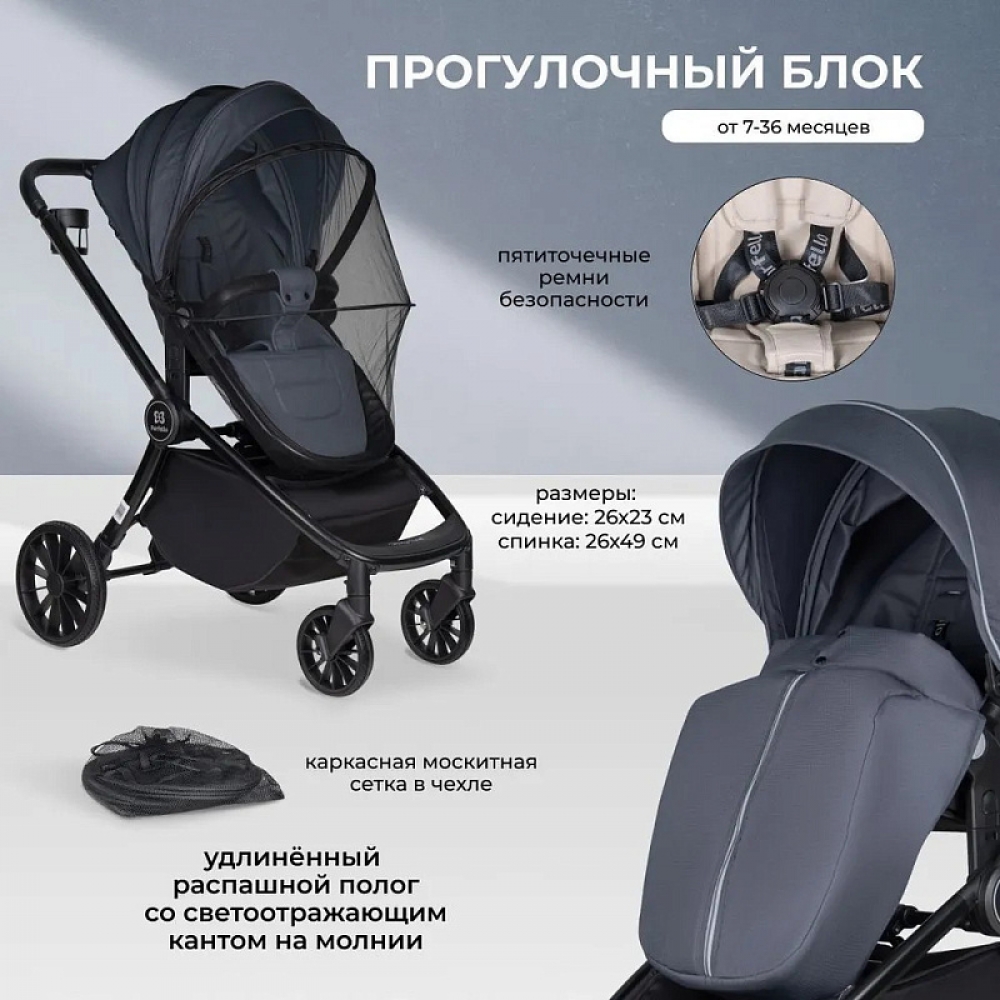 Прогулочный блок (с 7 до 36 мес): 3 положения регулировки угла наклона спинки при помощи кнопки. Для безопасности предусмотрены пятиточечные ремни безопасности, разделитель для ног и съемный бампер. Прогулочный блок имеет глубокий трехсекционный капюшон со скрытым окошком для вентиляции.