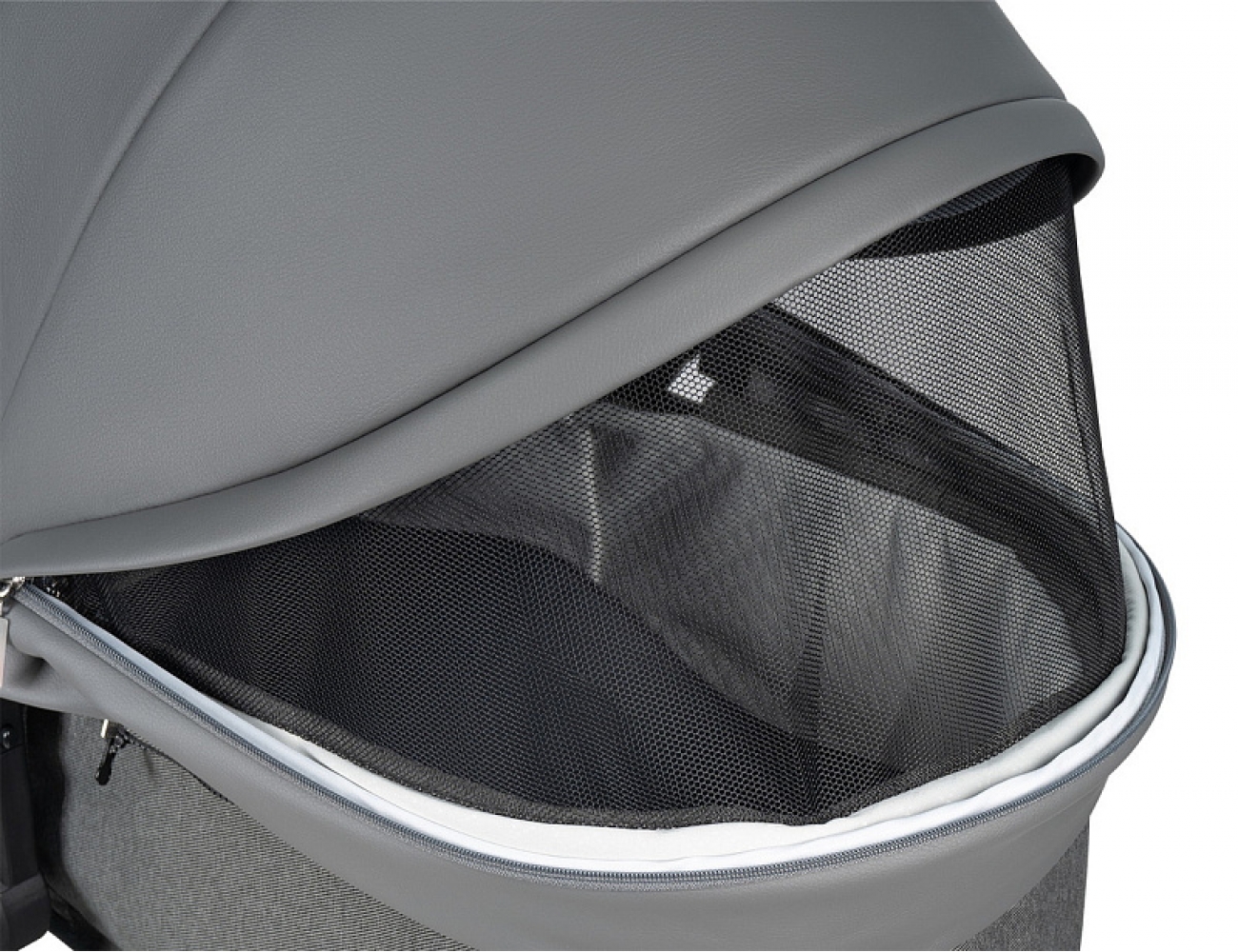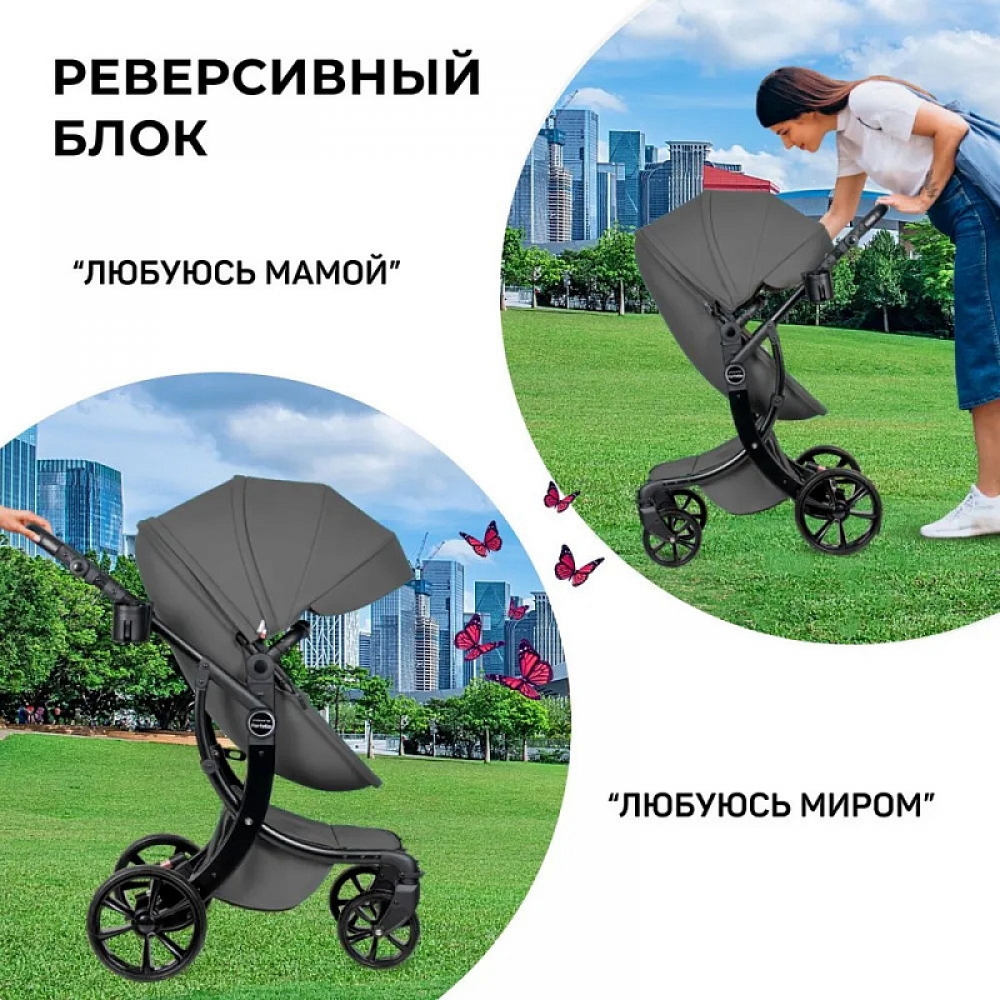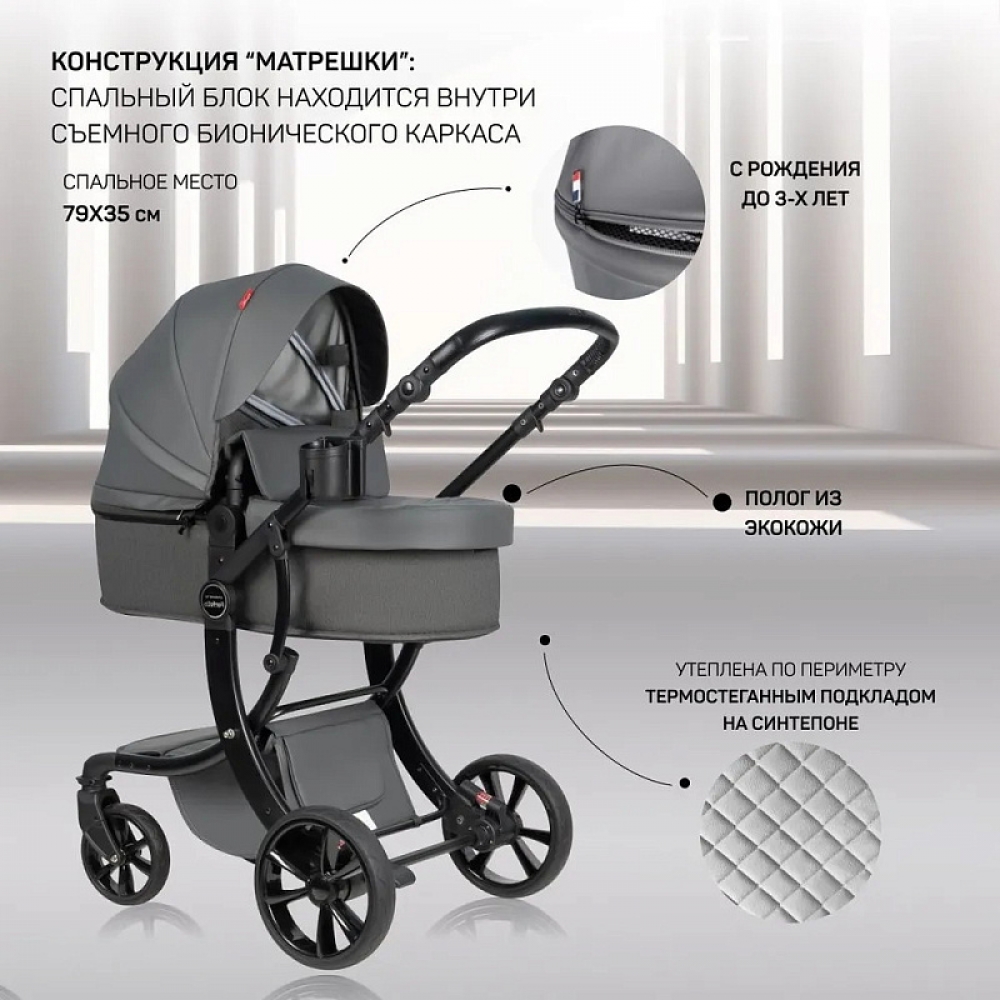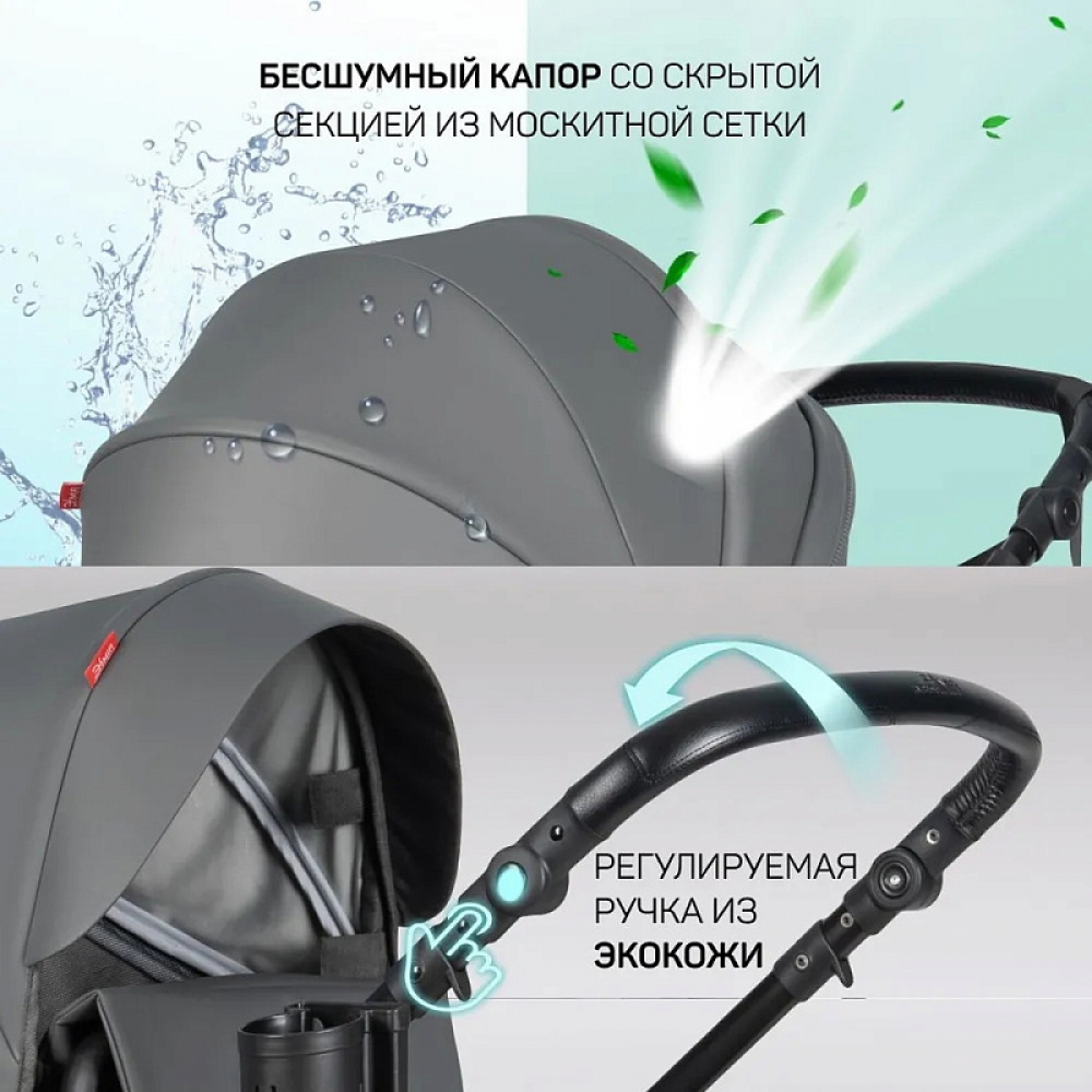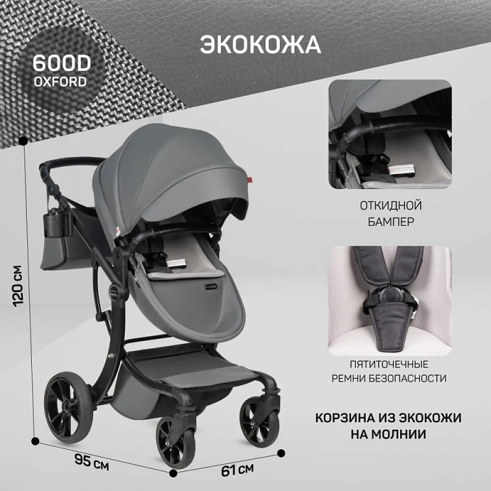 1. Коляска-трансформер Aimile PRO подходит для использования круглый год. Капюшон и полог для люльки выполнены из экокожи, что делает уход за ними очень простым - достаточно протереть влажной салфеткой.