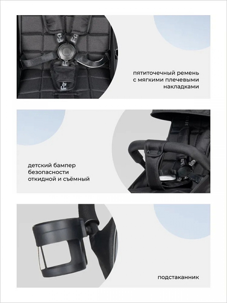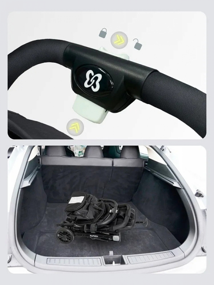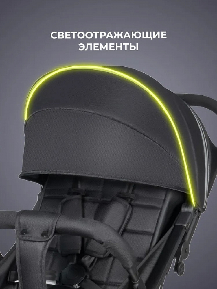 В сложенном состоянии прогулочная коляска стоит вертикально. Колеса с протектором изготовлены из материала EVA. Передние колеса вращаются на 360, что улучшает управляемость.