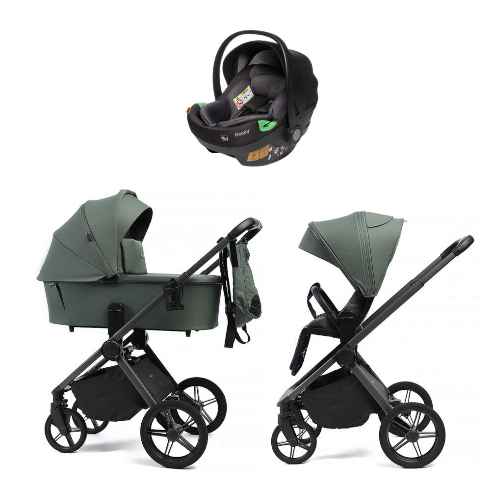 Детская коляска Peppy Monaco 3 в 1 с автокреслом First Oliva Green (зеленый), рама черная