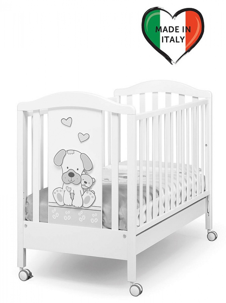 Кровать изготовлена из массива бука и имеет регулируемый подматрасник, позволяющий установить дно кровати на двух уровнях. Края кровати закруглены для повышения безопасности. Кровать также оснащена большим и удобным ящиком. Все материалы, используемые в изготовлении кровати, являются нетоксичными. Кровать имеет поворотные прорезиненные колеса, два из которых оснащены тормозами. Дизайн и производство кровати выполнены в Италии.