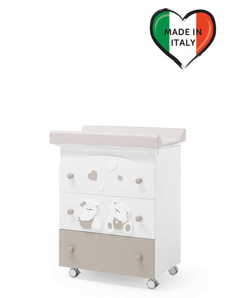 Крышка комода оснащена европейскими петлями со специальными пружинами, которые предотвращают её случайное падение. Мягкий пеленальный столик с покрытием из ПВХ обеспечивает малышу комфорт во время пеленания.