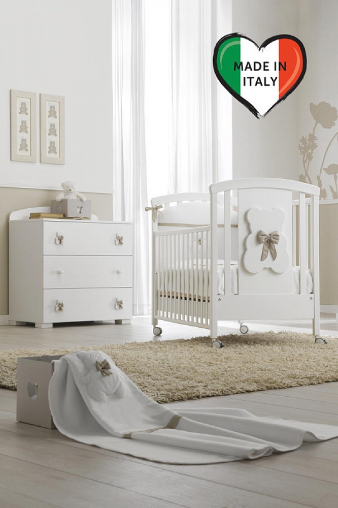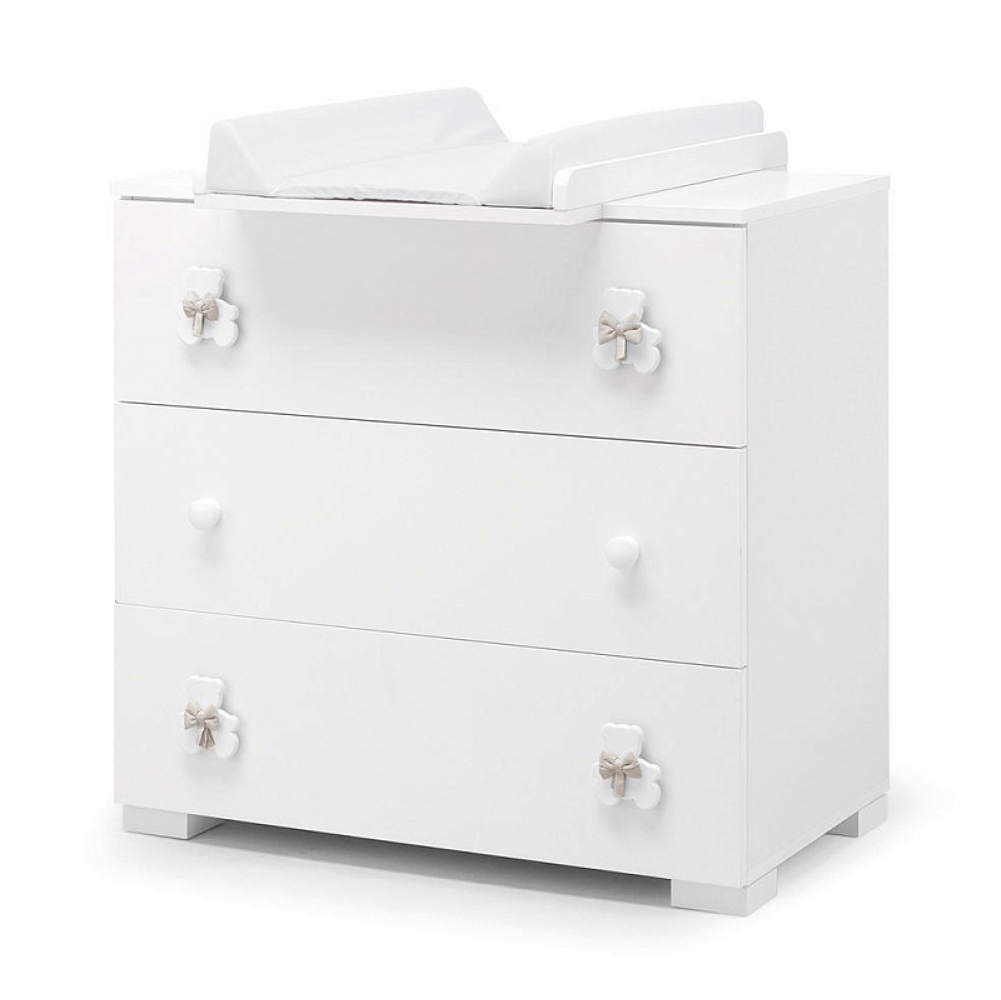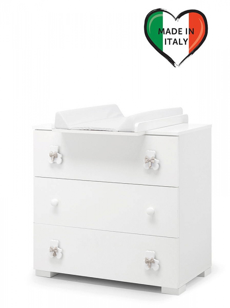 Тумба-комод с пеленальным столом Erbesi Dudu представляет собой прекрасную мебель из эксклюзивной итальянской коллекции для детской комнаты. Она имеет прочный каркас, а ящики и фасады выполнены из панелей с нулевым уровнем формальдегидов, покрытых ПВХ материалом. Кроме того, тумба оснащена деревянными ручками в виде мишки с бантиком.