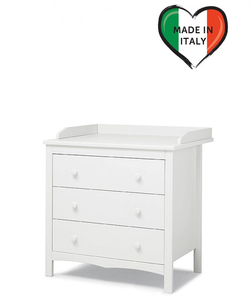 Итальянская тумба Erbesi Sonia с рамой из массива бука с мелкой резьбой, панелями из ДСП класса Е1 с низким уровнем эмиссии формальдегида, покрытые материалом ПВХ. У тумбы имеется съемная панель для пеленального столика, ручки выполнены из массива бука.
