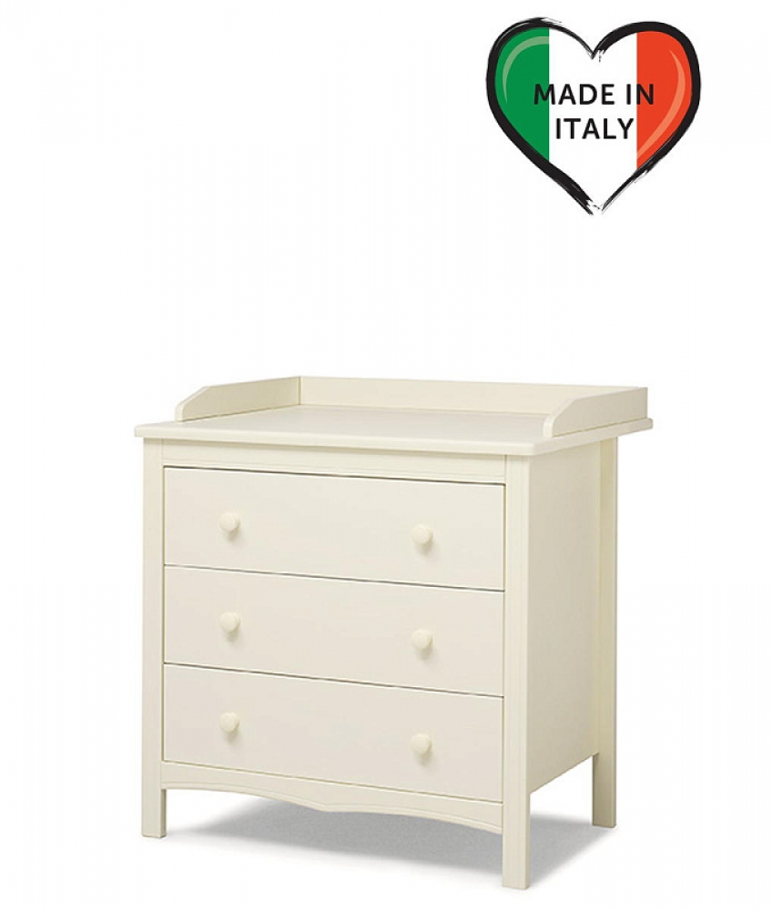 Итальянская тумба Erbesi Sonia с рамой из массива бука с мелкой резьбой, панелями из ДСП класса Е1 с низким уровнем эмиссии формальдегида, покрытые материалом ПВХ. У тумбы имеется съемная панель для пеленального столика, ручки выполнены из массива бука.
