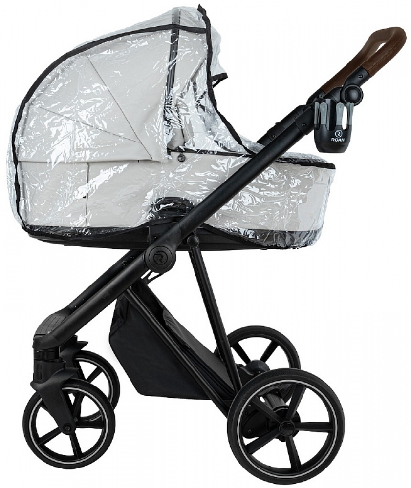 Чехол в люльке имеет отворот со смотровым окошком. Окошко выполнено из морозостойкого силикона. Чехол люльки крепится на магнитах к основанию люльки.  Такой способ – это уникальная новая система крепления чехла от производителя колясок ROAN. Такой способ крепления позволяет моментально закрепить или снять чехол с люльки.