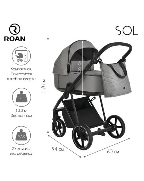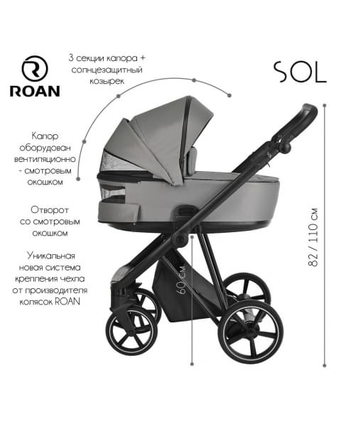 Рама в коляске SOL изготовлена из алюминия, с нанесением профессионального покрытия и укреплённого в печи под температурой. Конструкция рамы имеет амортизатор, специально разработанный для данной модели коляски, который компенсирует неровности дорожного покрытия и делает ход коляски плавным. В конструкции рамы производитель Roan применяет собственные разработки деталей (узлов), например, тормозная система, механизм крепления люльки, механизм складывания и др. Это отличает данного производителя колясок от других фирм, которые используют универсальные узлы во всех колясках разных моделей. Колеса в коляске ненадувные из специального вспененного геля (гелевые). Такое колесо невозможно пробить, не требует подкачек, а ход его очень мягкий. Гелевое колесо хорошо зарекомендовало себя как в жару, так и в холод. В каждом колесе установлен двойной подшипник, что делает ход коляски беззвучным. На основании рамы крепится компактная стильная корзина. Несмотря на свой компактный вид, корзина довольно вместительная и имеет возможность увеличения.