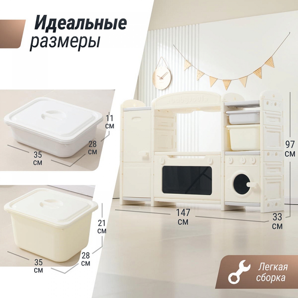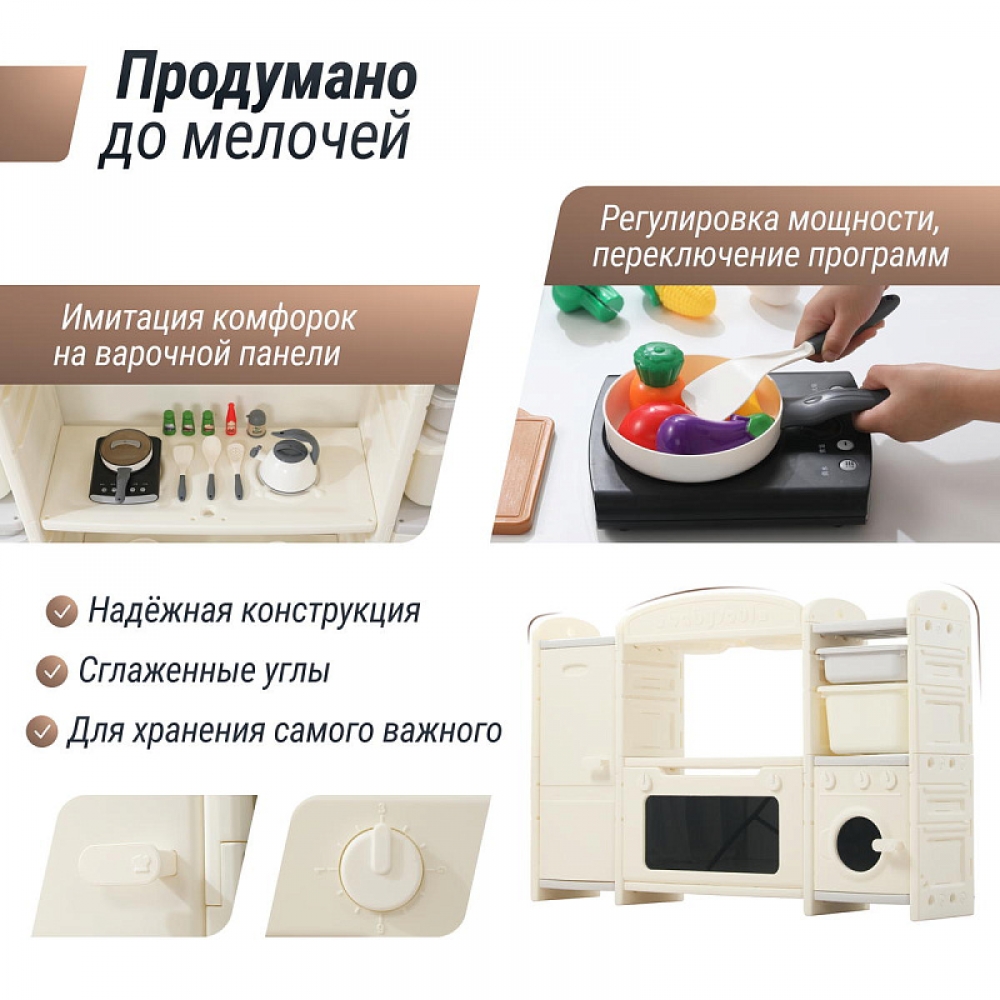 Игрушечная кухня 1+ изготовлена из пищевого пластика, который прошел строгие тесты на безопасность. Мы заботимся о здоровье и безопасности маленьких пользователей, поэтому каждая деталь продумана до мелочей – сглаженные углы без зазубрин, надежная конструкция. 48 элементов кухни легко очищаются от загрязнений, что делает их идеальными для игр. Просто протрите их влажной салфеткой — и они снова готовы к игре!