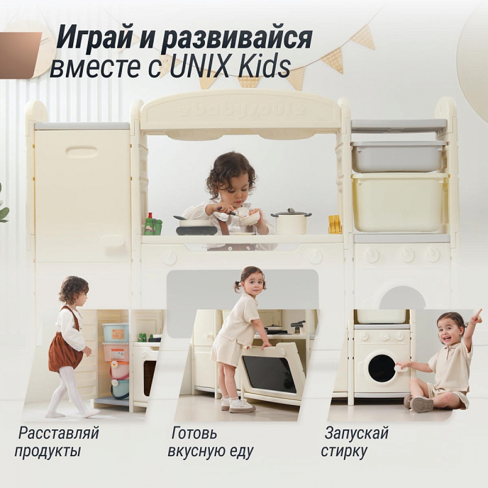 Детская игровая кухня-стеллаж UNIX Kids Cook & Store станет настоящим центром притяжения для любого ребенка! Вы можете выбрать разнообразные комплектации кухни: с плитой, духовкой, холодильником, вместительными ящиками с крышками и полным набором посуды. Детская игровая кухня-стеллаж UNIX Kids Cook & Store не только подарит малышу множество часов увлекательной игры, но и поможет развить важные навыки, такие как ролевая игра, воображение и мелкая моторика.