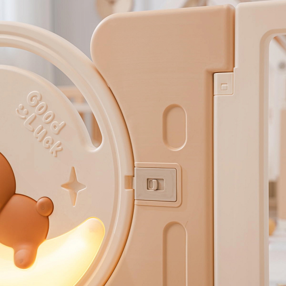 Мы предлагаем не просто манеж ограждение, а стильный игровой манеж с подсветкой двери, который подойдет под Ваш интерьер и включает в себя: теплый большой коврик, два коврика с маленькой секцией; уютный домик длиной 79 см, глубиной 81 см (внутреннее расстояние). Высота игрового домика в верхней точке составляет 113 см, что позволит вашему ребенку чувствовать себя в нем комфортно. Манеж оснащен качелями шириной 34 см, глубиной 21см и высотой посадки от пола на 1-м уровне – 33см и на 2-м уровне – 41см. Расстояние в качелях составляет 79 см. Входная дверь в манеж достаточно широкая - 80,5 см.